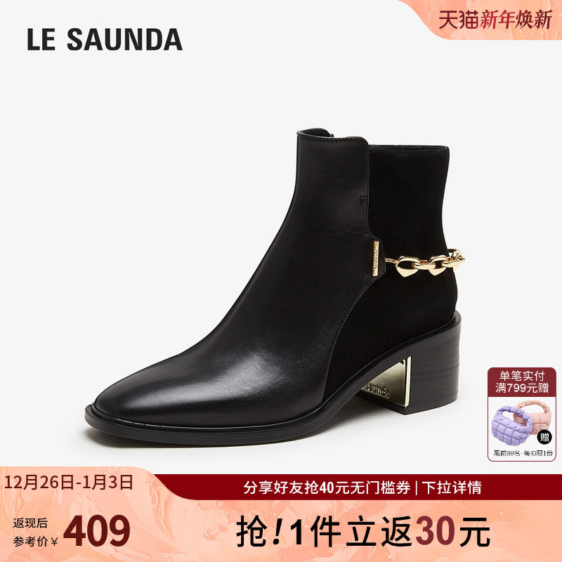 莱尔斯丹秋冬商场同款时尚链条圆头拉链粗跟女鞋短靴4T53901