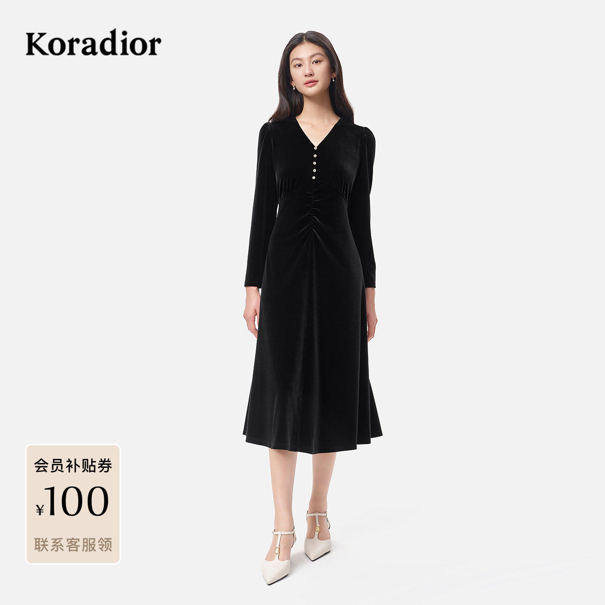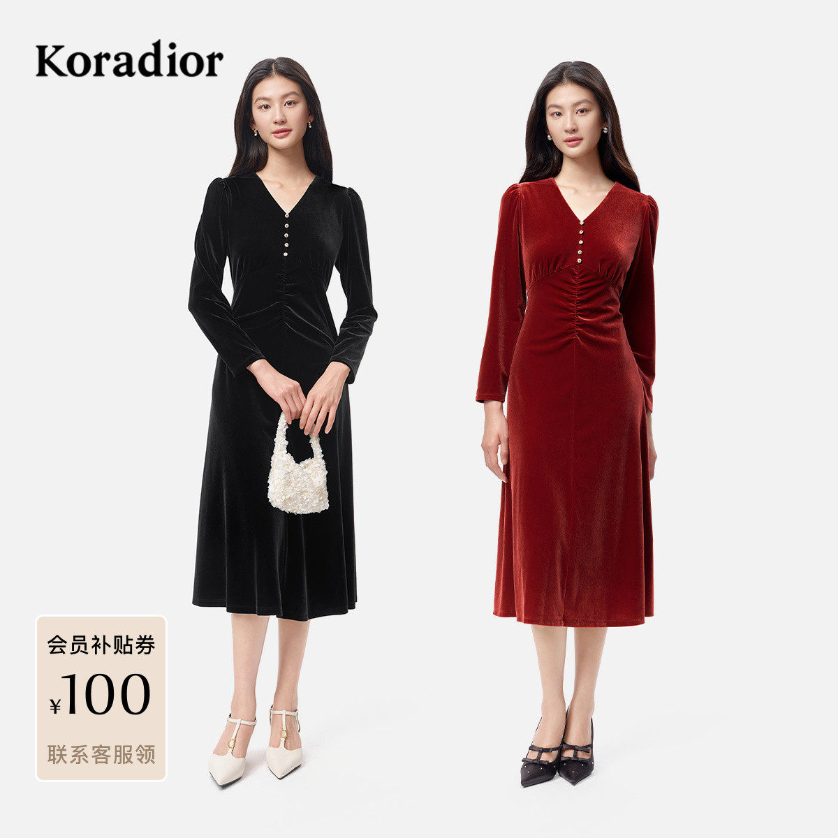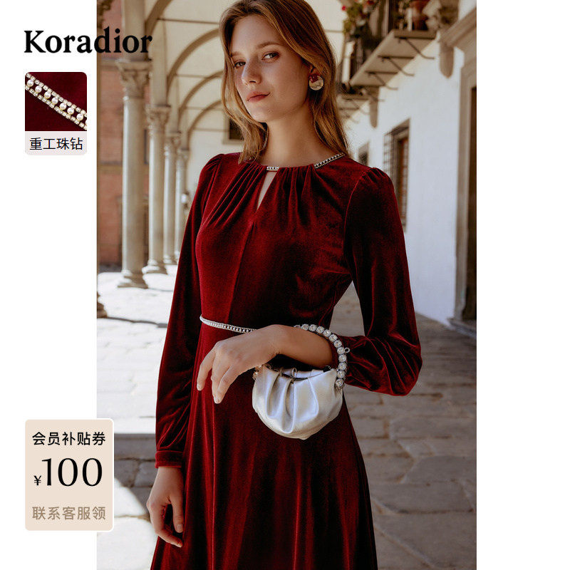 koradior珂莱蒂尔2025秋季新款法式收腰绒感烫钻连衣裙显瘦千金风