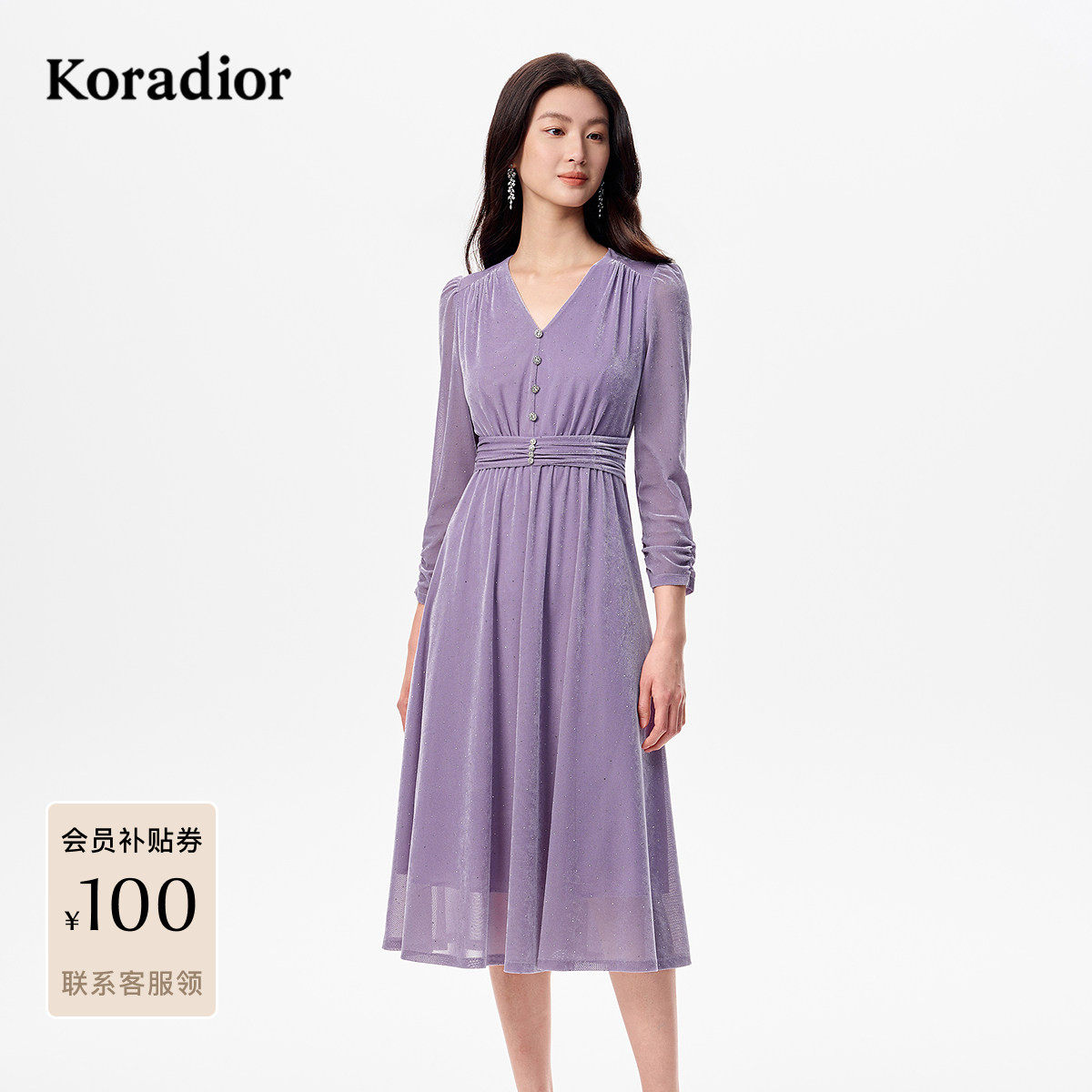 koradior珂莱蒂尔秋季丝缕紫韵优雅羊毛长袖拼接百褶连衣裙女
