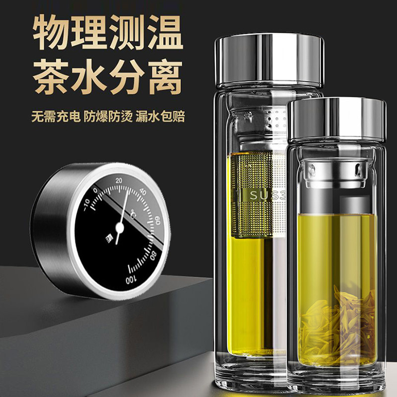 免充电双层玻璃杯防漏茶水分离杯子便携隔热水杯机械物理测温杯盖