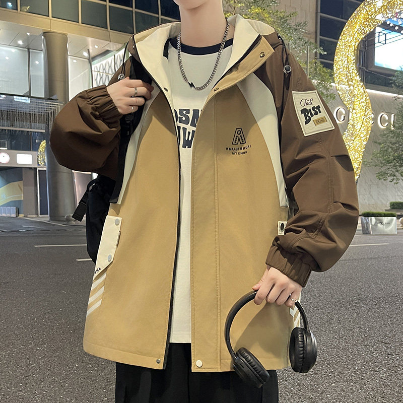 工装外套男2026新款春秋季连帽夹克男潮牌青少年撞色拼接上衣服男