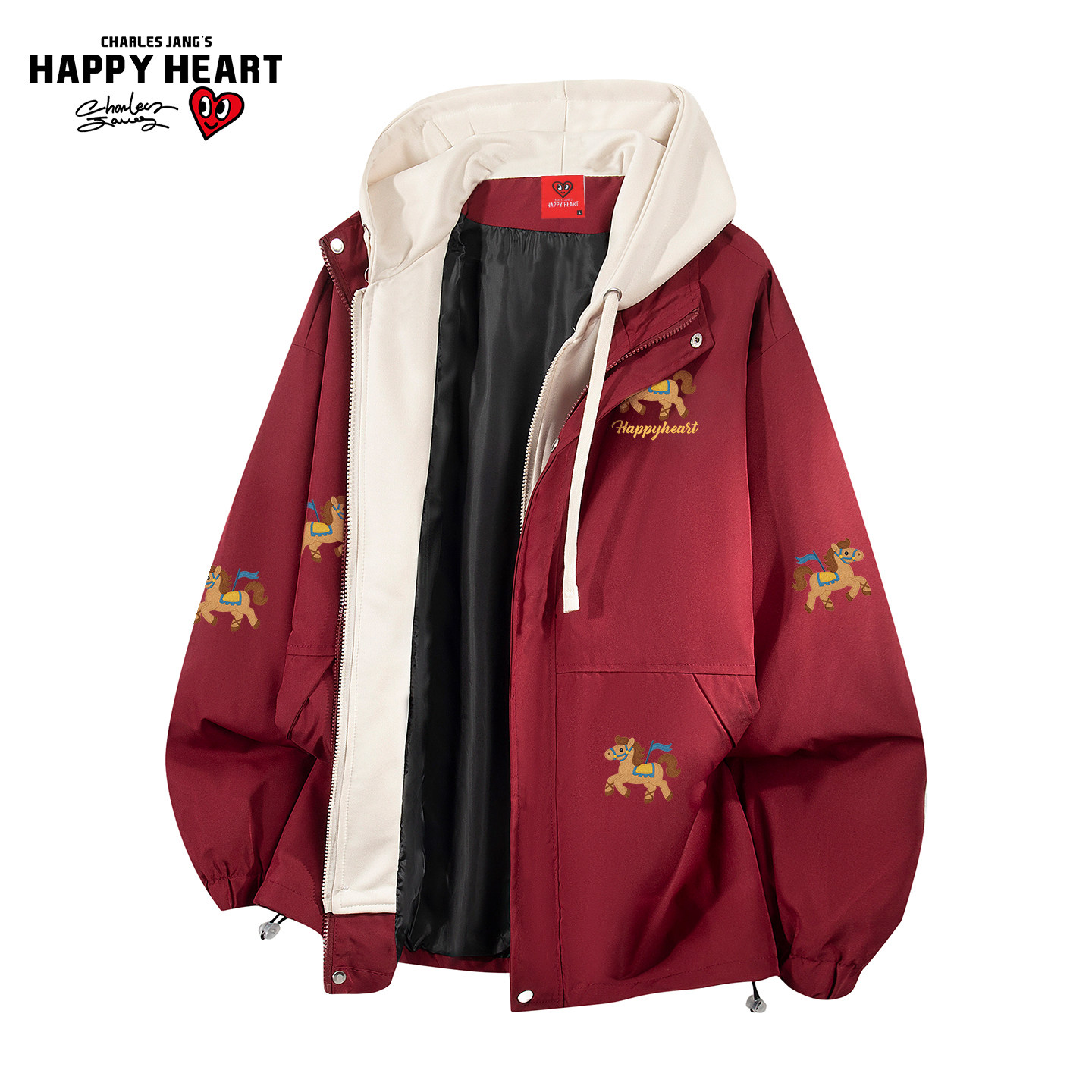查尔斯桃心迎春马年红色假两件连帽夹克男春秋季小马印花撞色外套