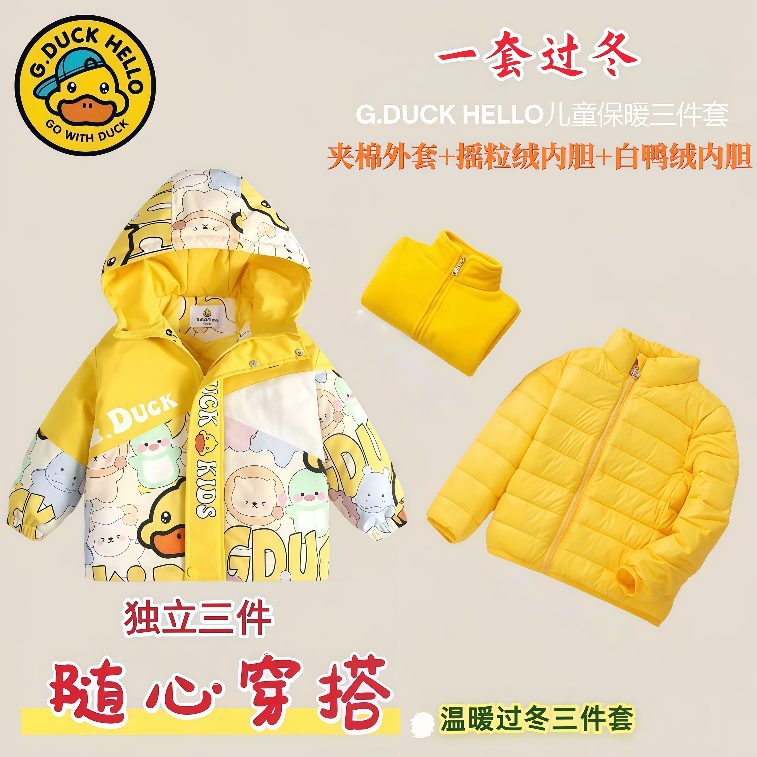 正品小黄鸭儿童冲锋衣三合一可拆卸女童套装秋冬款男童宝宝两件套