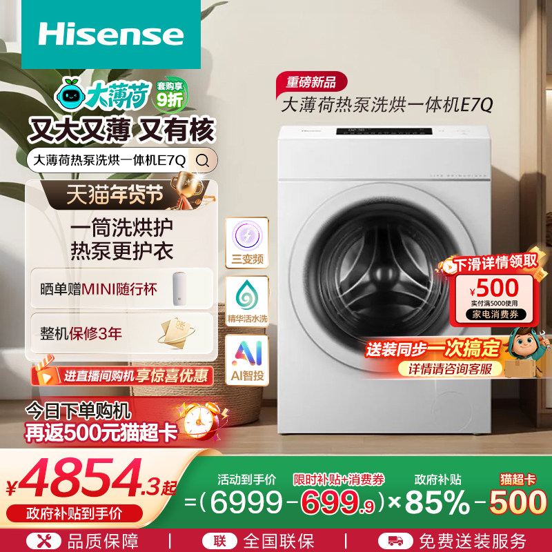[热泵]海信大薄荷13KG大容量滚筒洗衣机全自动三变频活水洗E7Q
