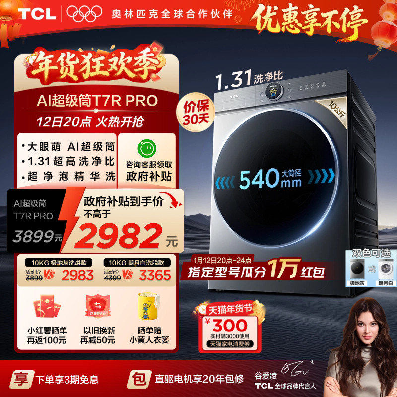 TCL大眼萌AI超级筒T7R PRO洗烘一体10KG滚筒洗衣机家用全自动国补
