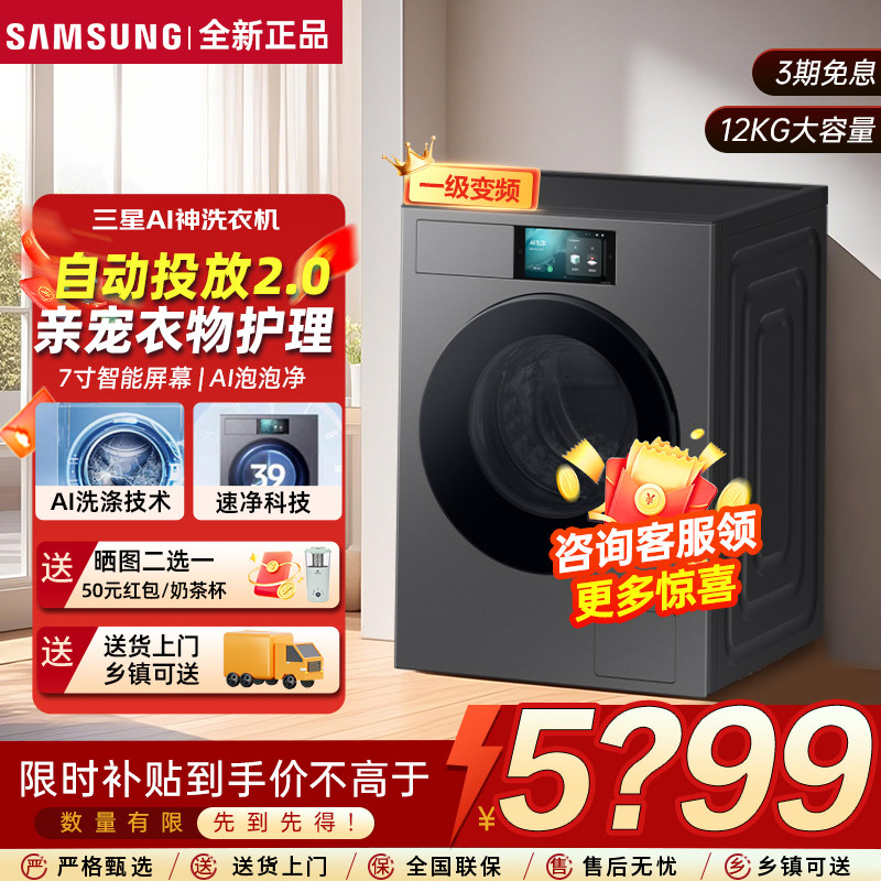 三星滚筒洗衣机7/9系 12KG家用大容量超薄变频节能除菌AI神洗衣机