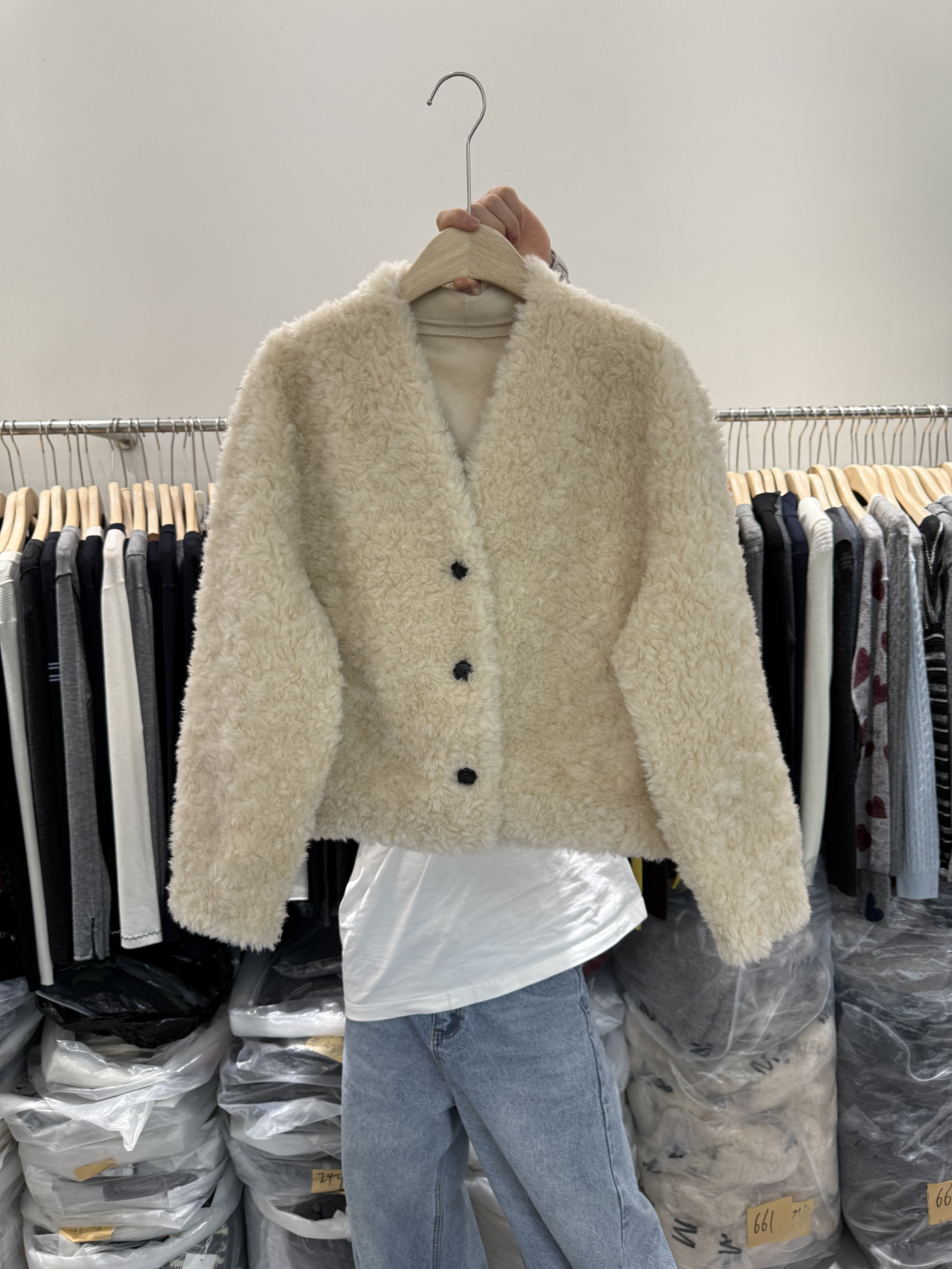 欧货100%绵羊毛颗粒绒皮毛一体外套女V领高级短款羊剪绒皮草上衣