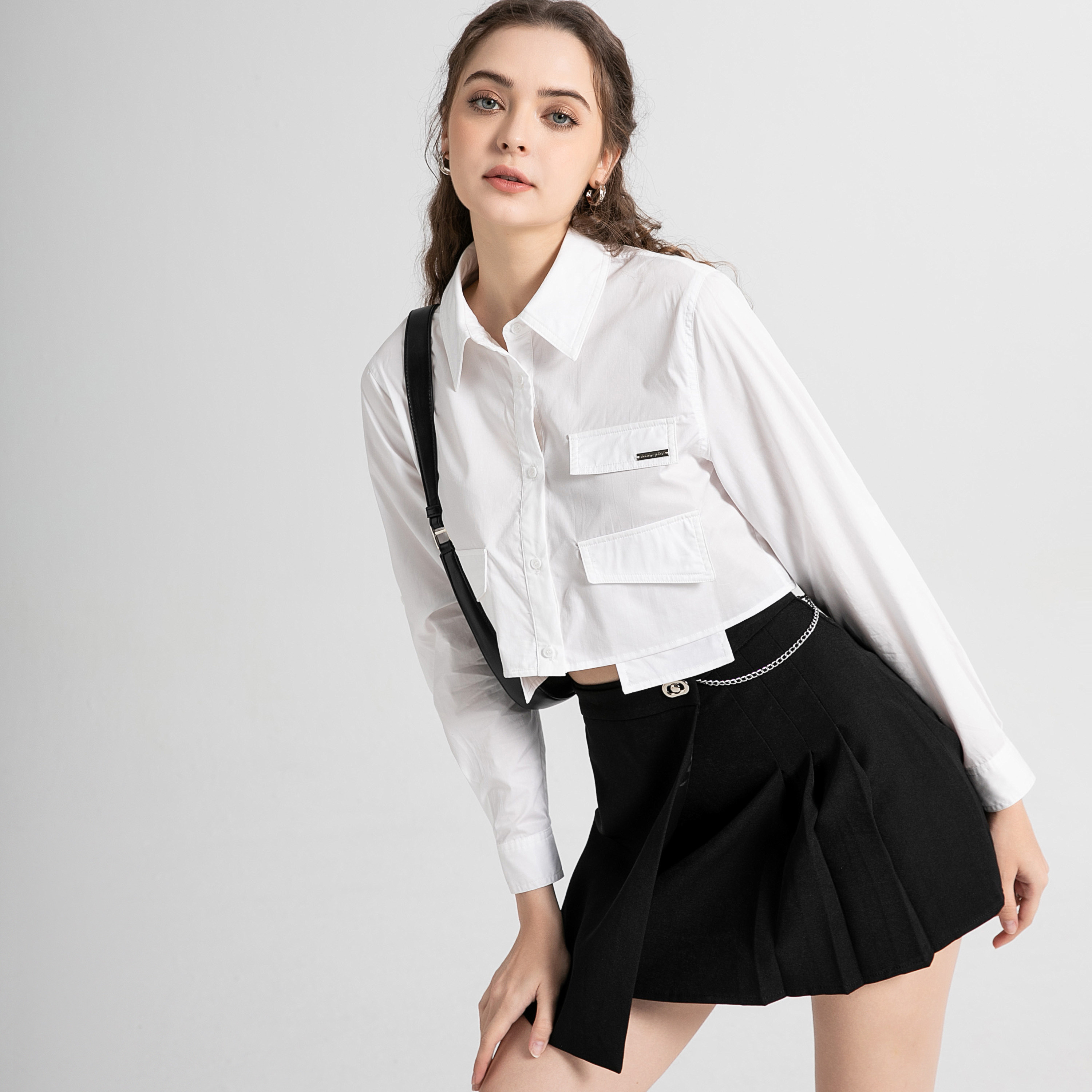 花清苓2025秋新款含棉女团口袋设计感衬衣个性休闲短款白色上衣