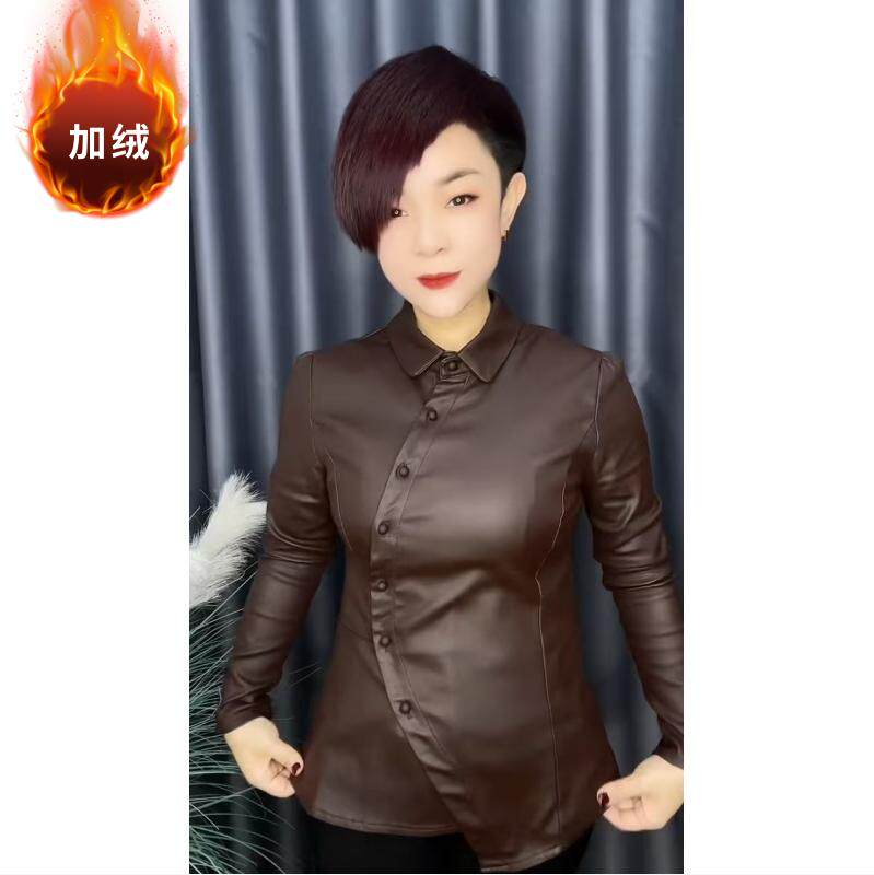 欧货PU衬衫女士秋冬新款翻领斜拼纽扣设计加绒保暖衬衣别致个性潮