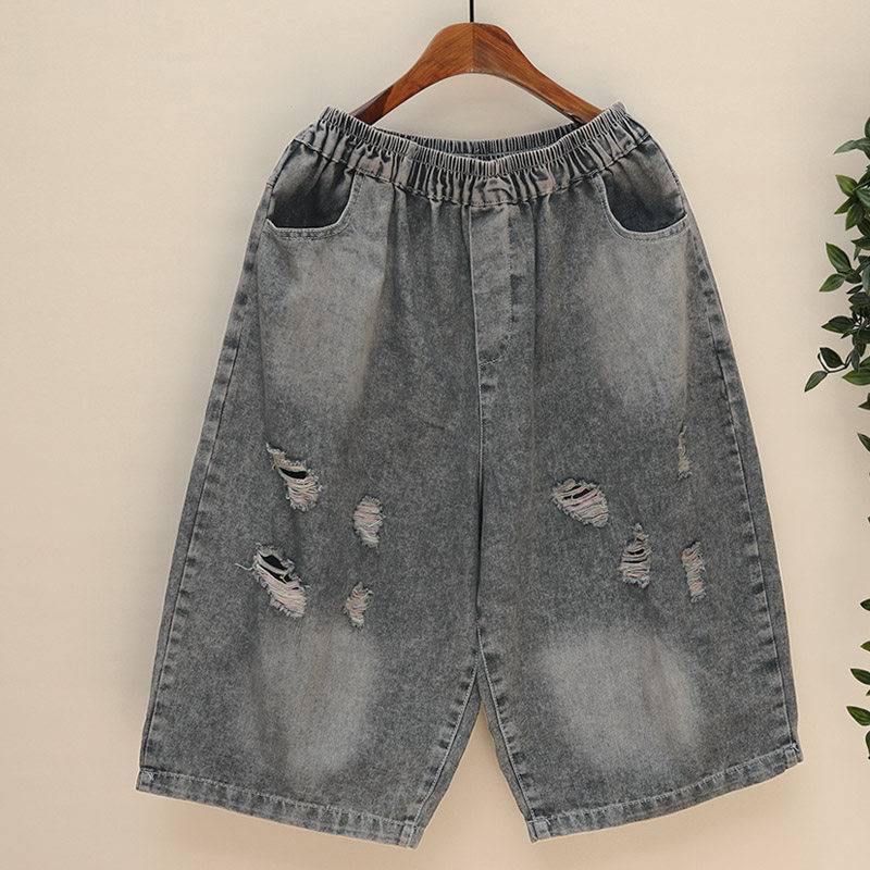磨破洞直筒牛仔六分裤女夏季个性设计感大码水洗做旧宽松阔腿中裤