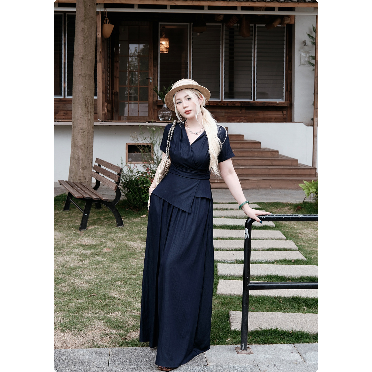 阔色短袖掐腰气质连衣裙子女2026新款春季早春漂亮穿搭通勤长裙夏