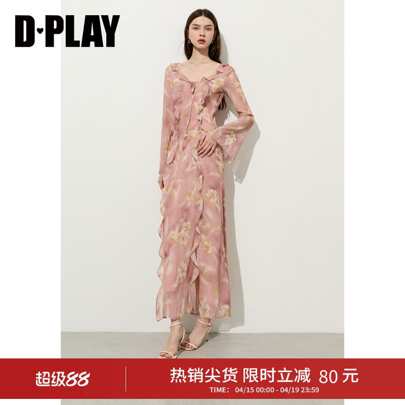 DPLAY粉色印花连衣裙女2026年春季新款U领荷叶边时髦气质长裙女