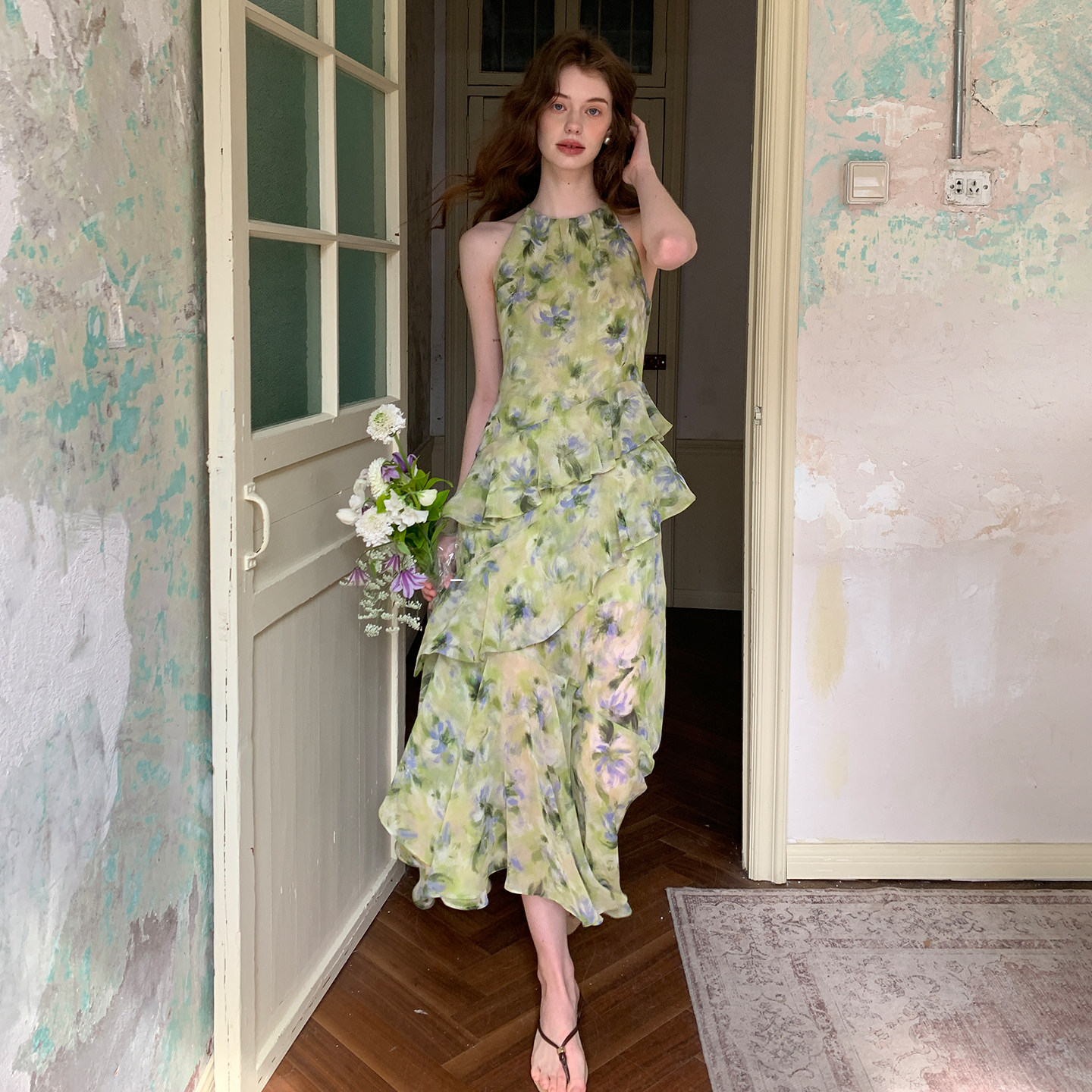 ZHUYIYI 新款高级感春季挂脖碎花吊带连衣裙女绿色长裙原创设计
