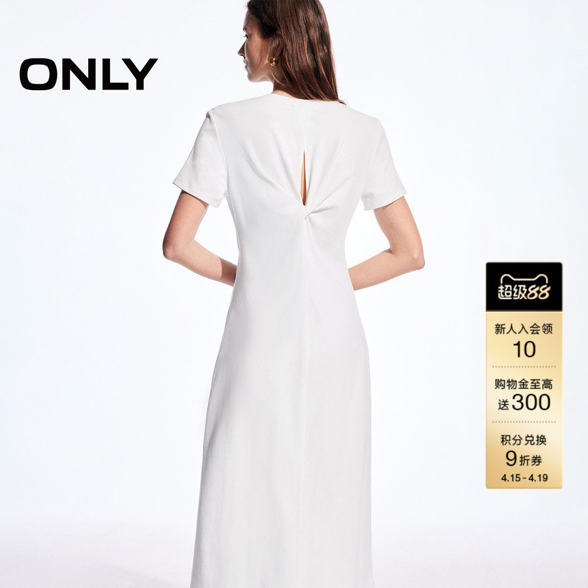 ONLY2026春季新款棉感亲肤气质短袖圆领立体扭结白色长裙连衣裙子
