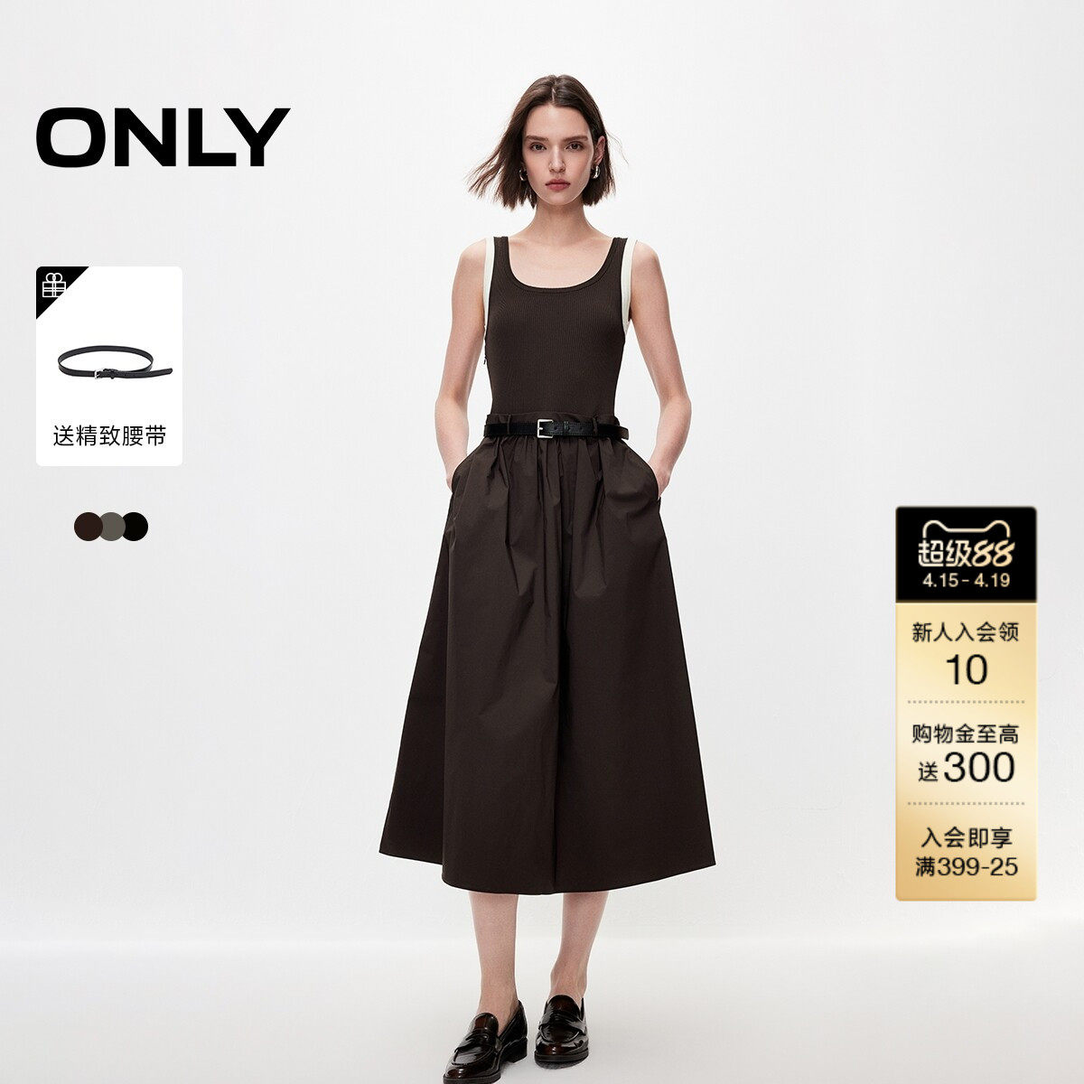 ONLY2026春季新款裙子撞色拼接精裁捏褶显瘦中长裙吊带连衣裙女