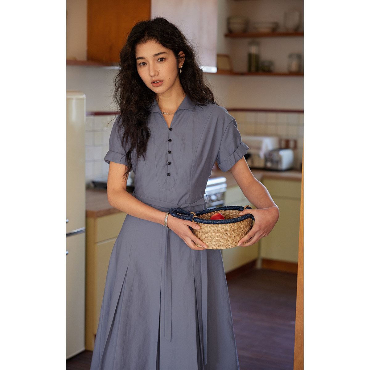 solighter 法式复古燕子领衬衫连衣裙春季2026新款短袖收腰长裙
