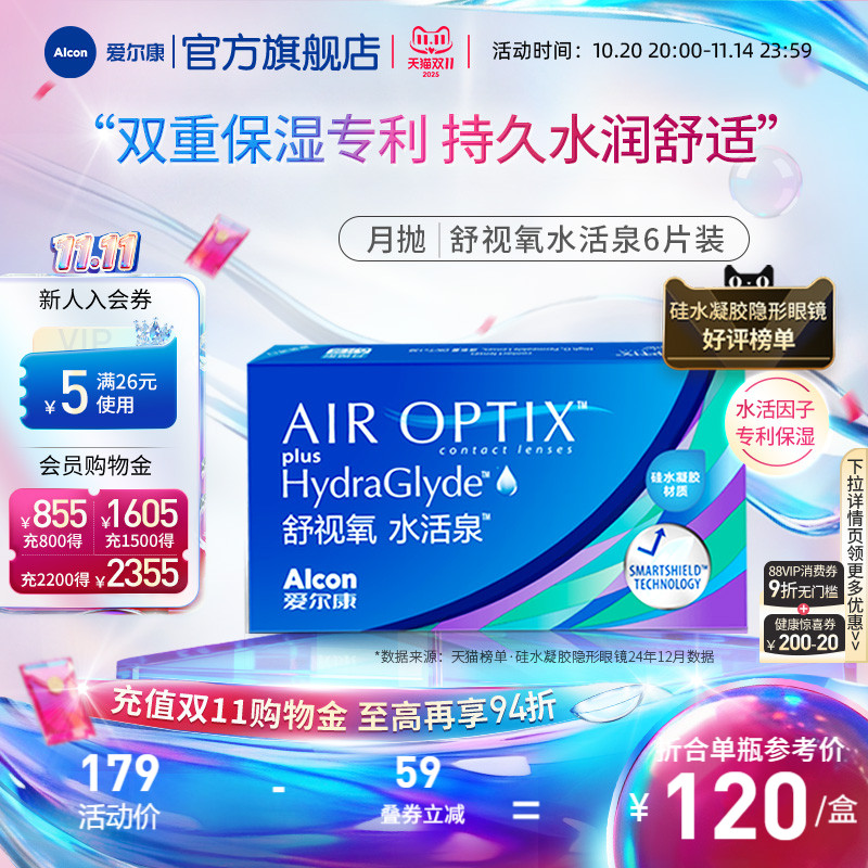 爱尔康视康舒视氧水活泉月抛3片近视隐形眼镜硅水凝胶高透氧运动