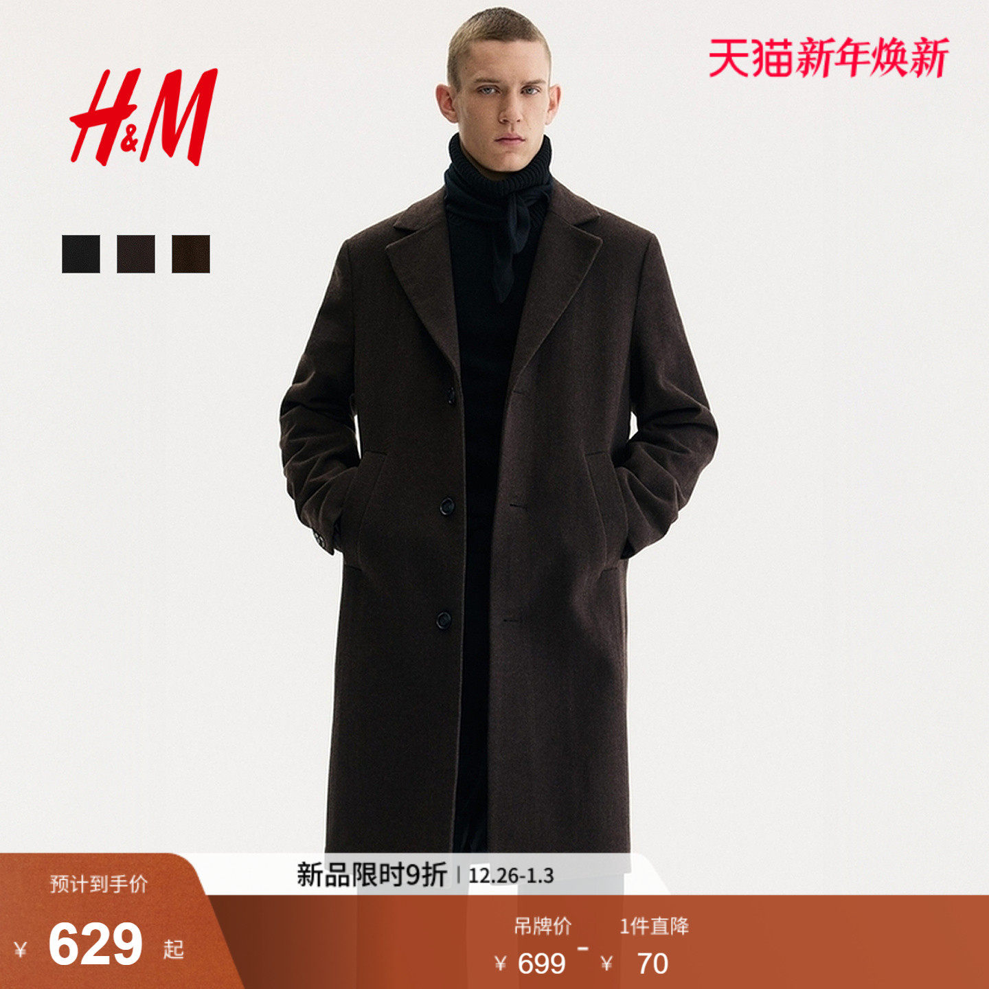 HM男装毛呢大衣2025冬季新款英伦风时尚单排扣长款外套1294108