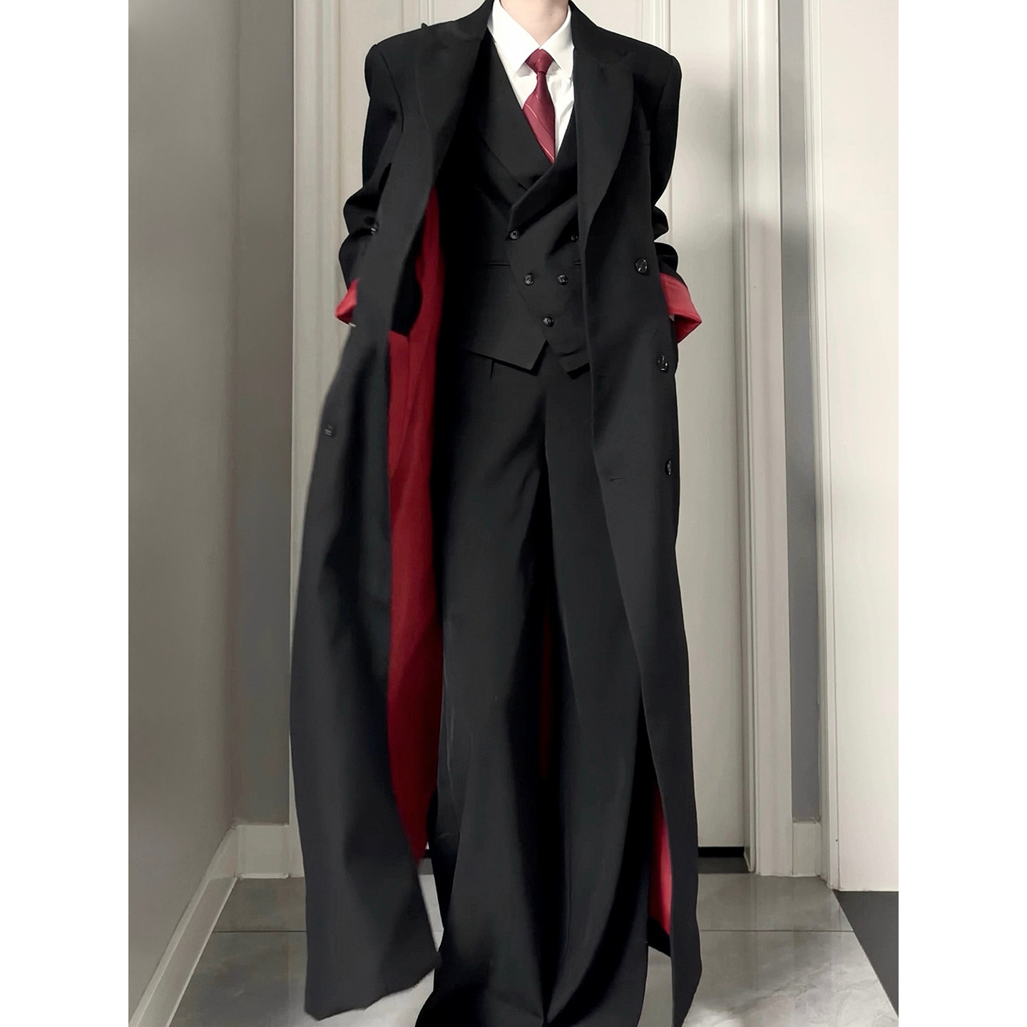 黑色巴尔玛肯风衣男英伦风高级感西装领外套黑红撞色长款收腰大衣