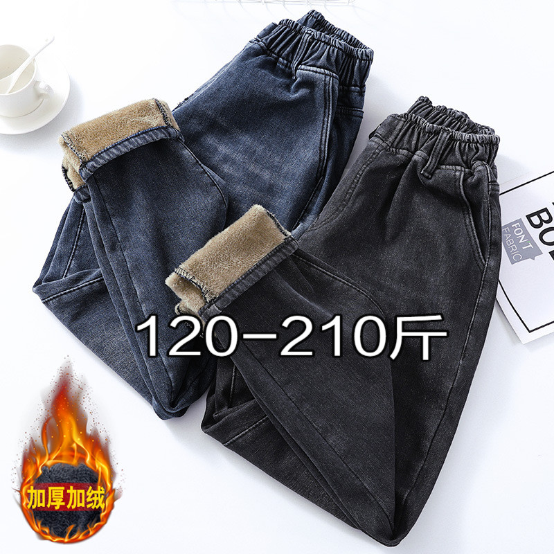 胖mm牛仔裤女大码200斤冬季加绒加厚松紧腰弹力显瘦萝卜哈伦裤子
