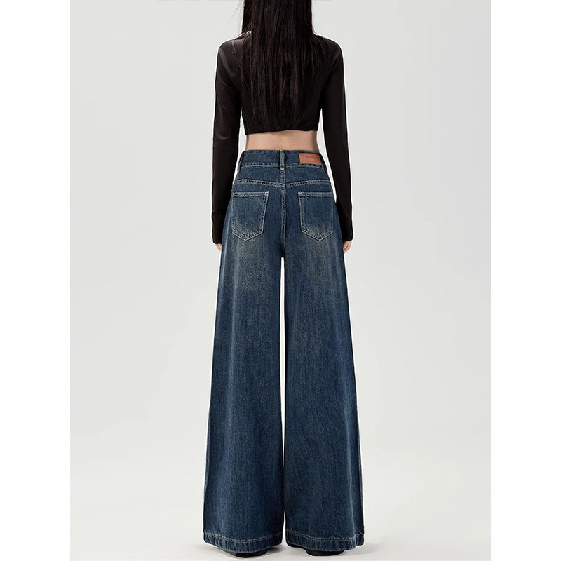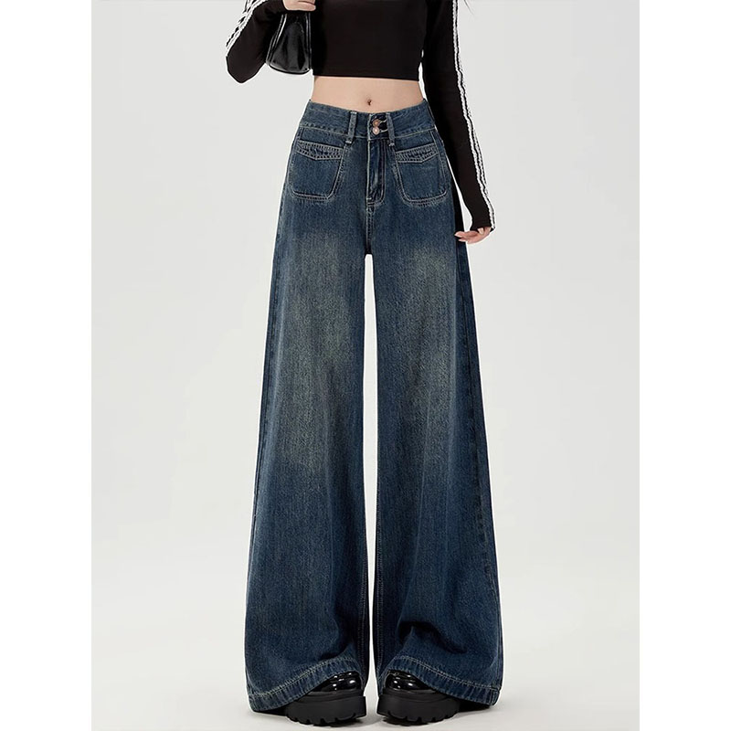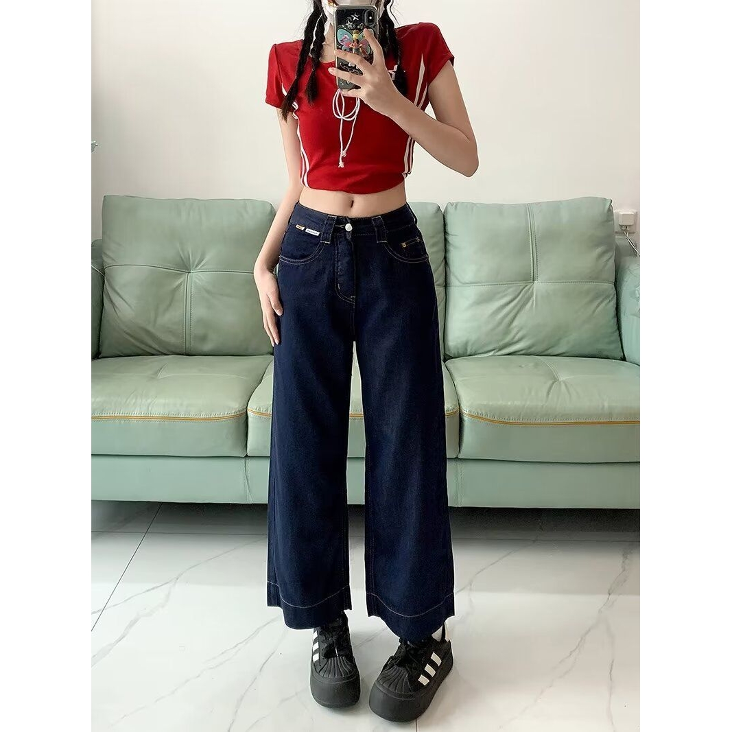 复古蓝直筒牛仔裤女秋季新款胖妹妹mm高腰宽松显瘦梨形身材阔腿裤