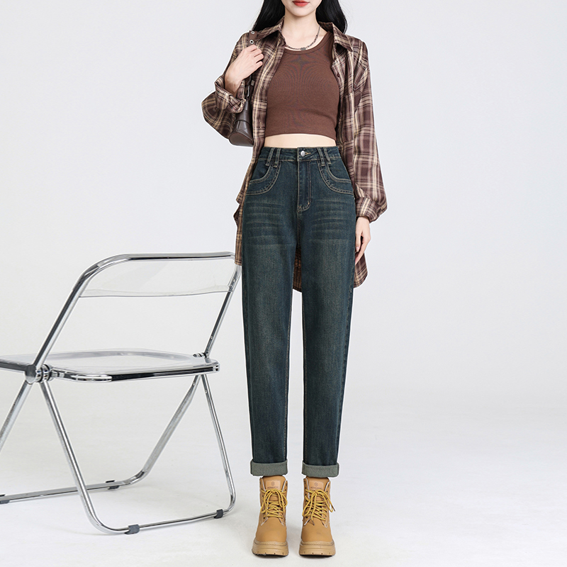 新款高腰直筒宽松大码胖MM牛仔裤女老爹裤小个子九分萝卜哈伦裤