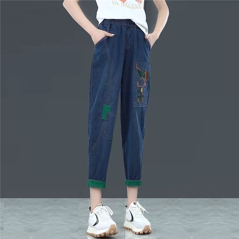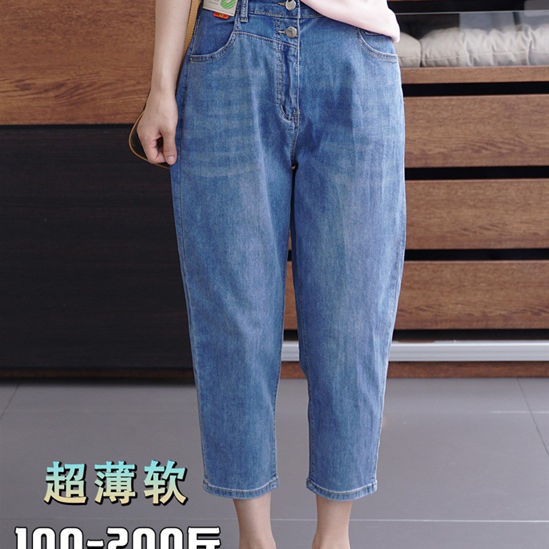 超薄软 100-200斤大码胖mm牛仔裤女款高腰显瘦弹力双扣九分哈伦裤