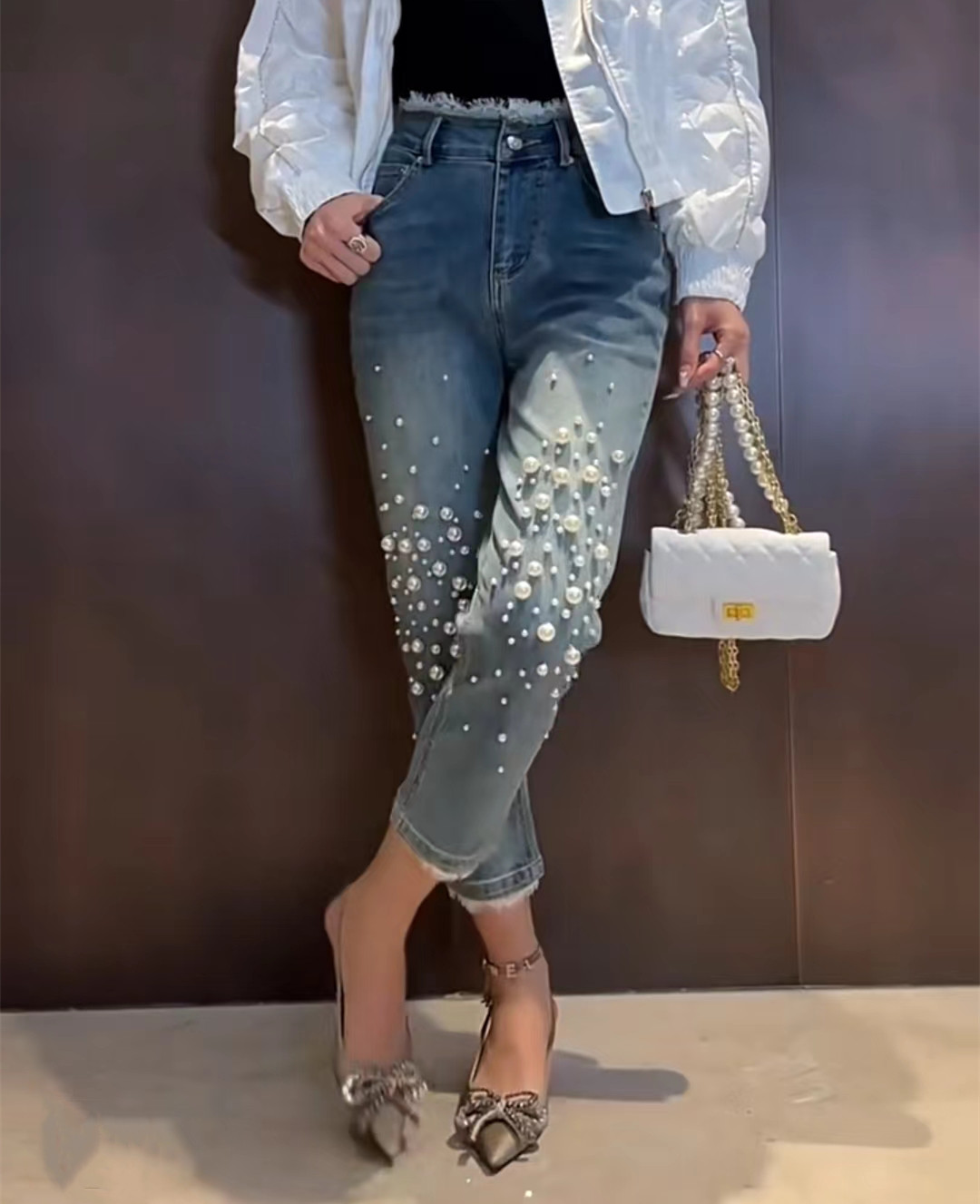 大码胖MM牛仔裤女欧洲站春季新款欧货小众个性钉珠洋气直筒烟管裤