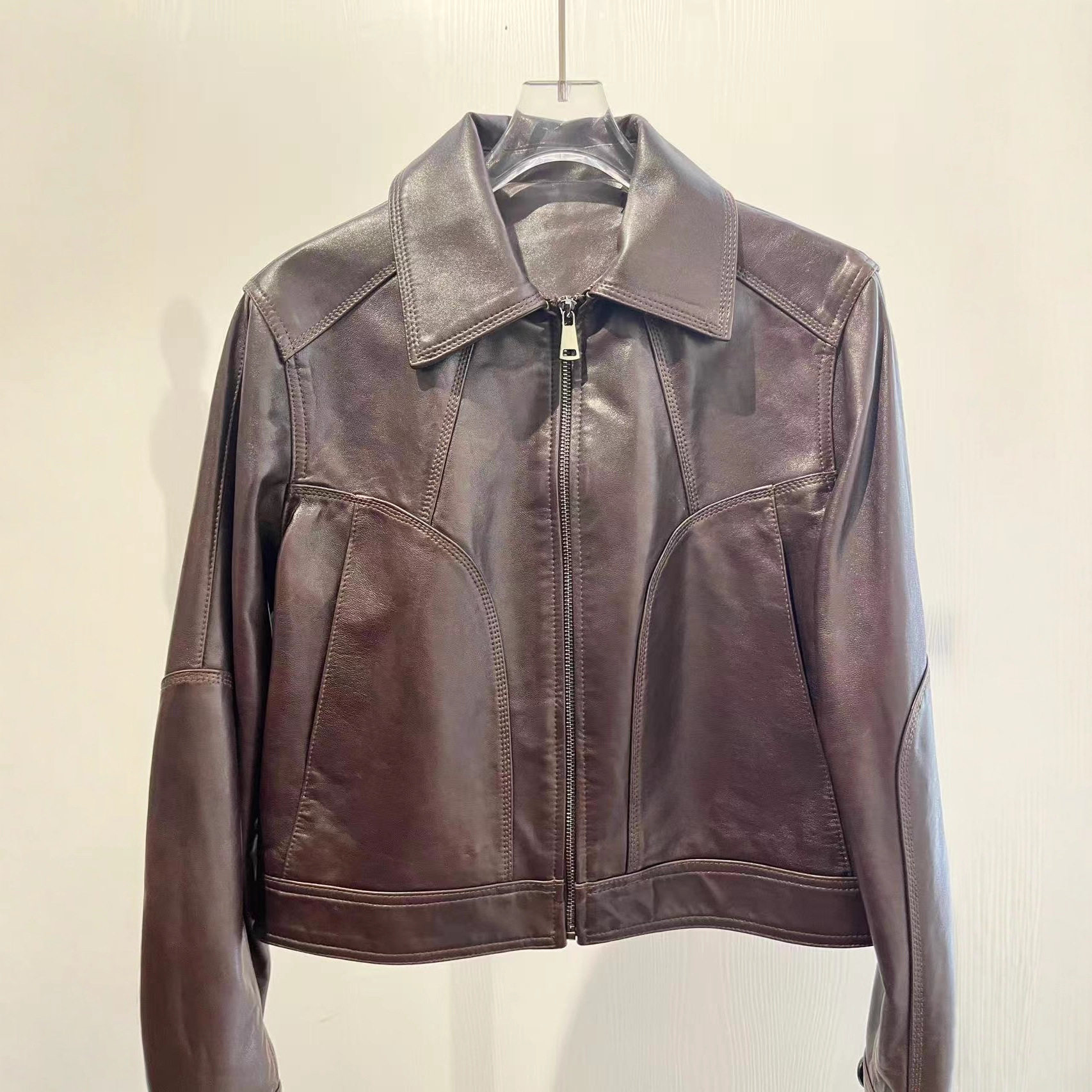 复古风新款真皮皮衣外套女款短款绵羊皮拉链款高级感圆领长袖夹克