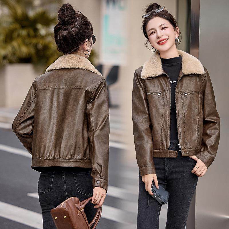 新款时尚真皮绵羊皮羊羔毛翻领皮衣女款短款百搭保暖夹棉外套夹克