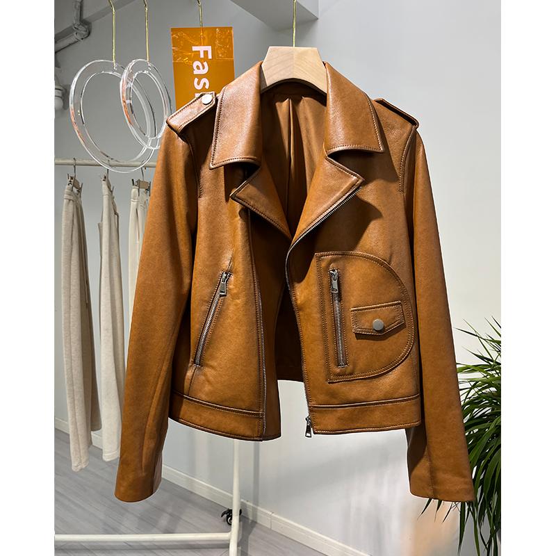 秋季新款真皮皮衣女款绵羊皮机车夹克外套翻领宽松显瘦欧美风简约