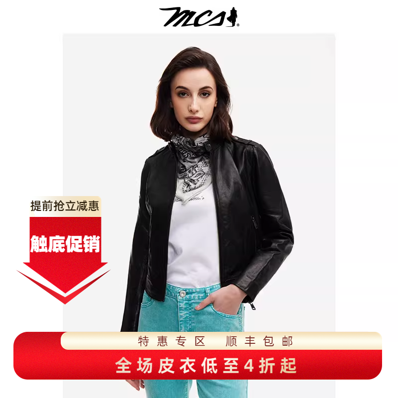 MCS女款秋冬羊皮真皮皮衣外套短款美式复古休闲立领时尚皮夹克女