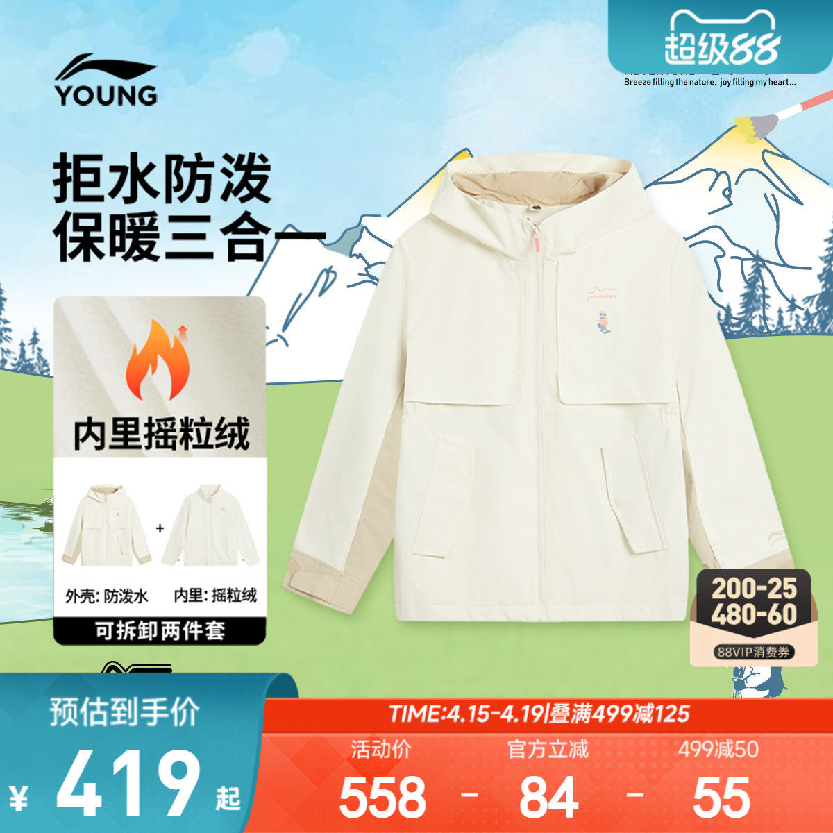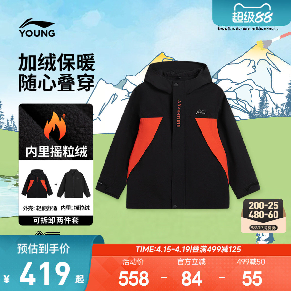 商场同款|李宁儿童三合一冲锋风衣防泼水加绒摇粒绒外套女大童装