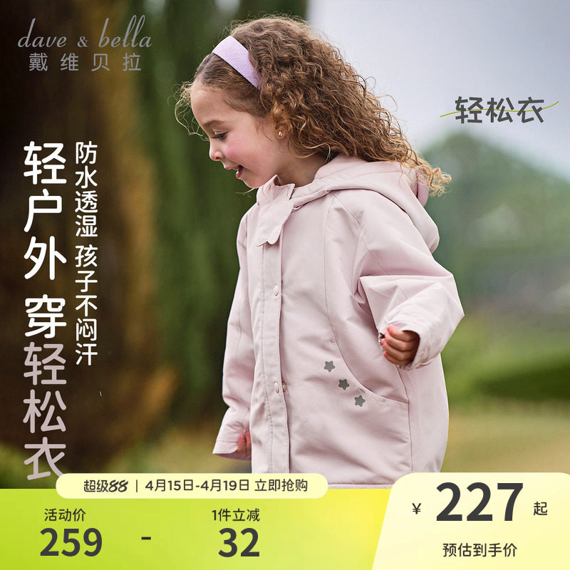戴维贝拉女童加绒外套2026春装新款儿童防水风衣厚宝宝A类冲锋衣