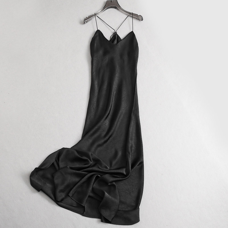 纯色凉感醋纤纹皱垂坠显瘦修身V领无袖吊带裙长裙女裙连衣裙K927