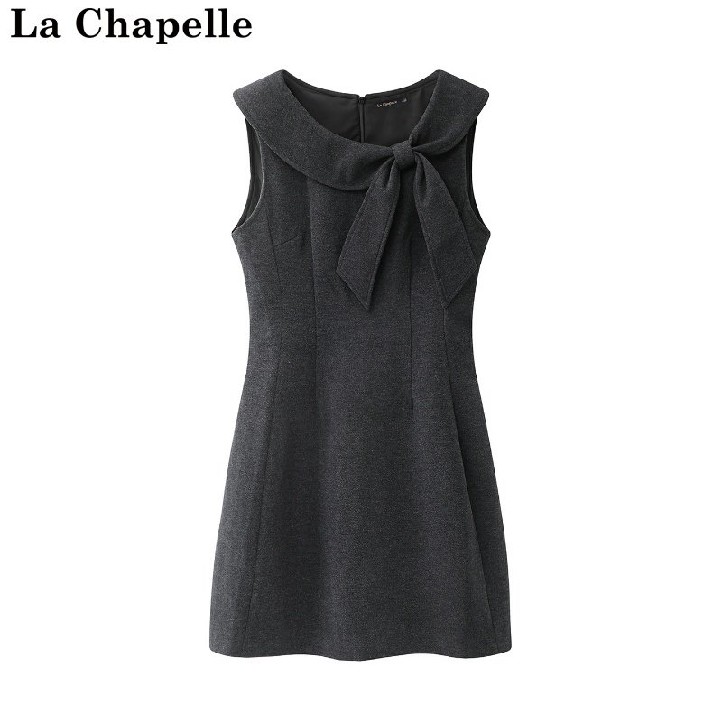 拉夏贝尔/La Chapelle冬季新款纯色法式蝴蝶结收腰修身无袖连衣裙