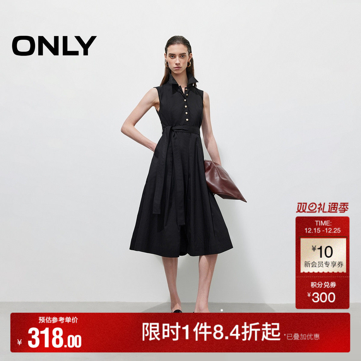 ONLY2025秋冬新款绑带收腰显瘦修身纯色翻领无袖A字长裙连衣裙女
