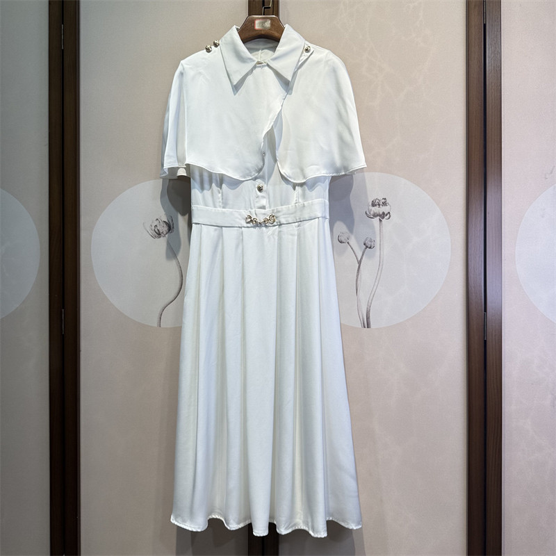 聚酯纯色时尚气质修身连衣裙衬衫领无袖花边荷叶设计A字裙32-3-2