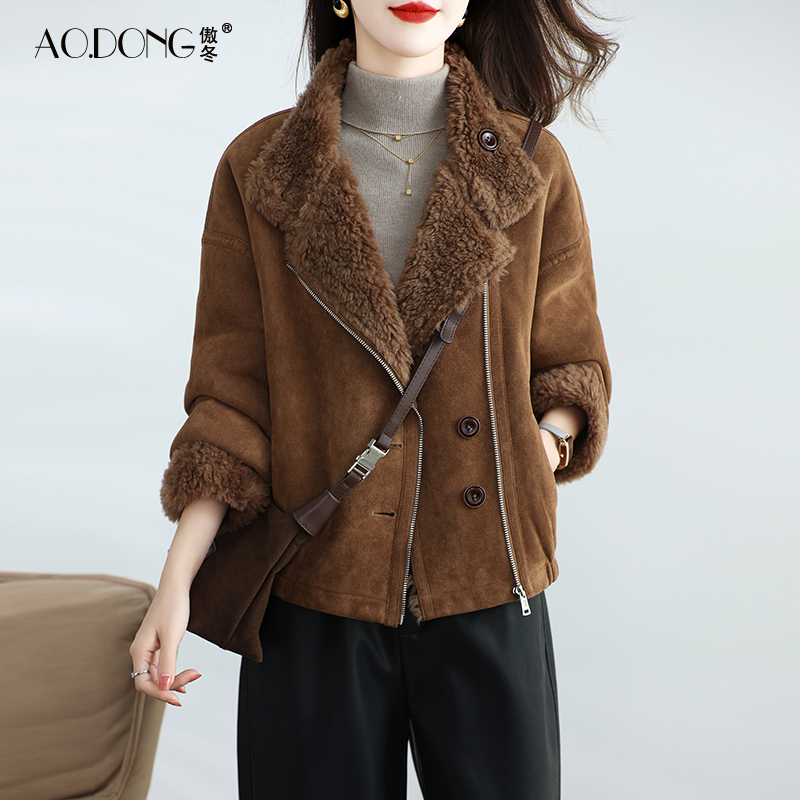 新款海宁颗粒绒皮草外套女麂皮绒短款一体保暖时尚羊羔毛大衣冬季
