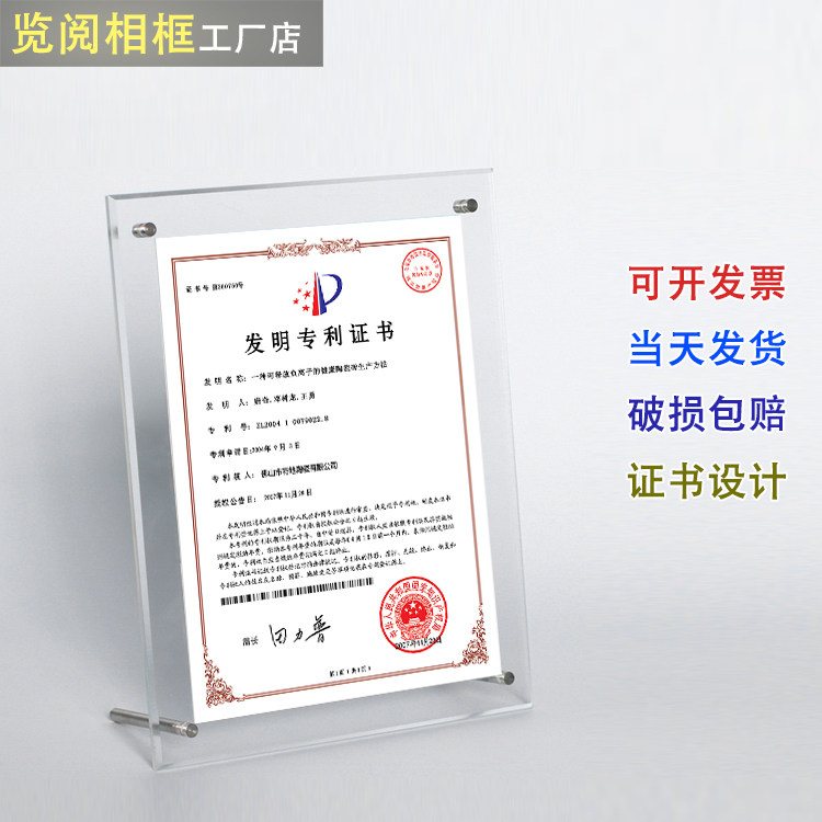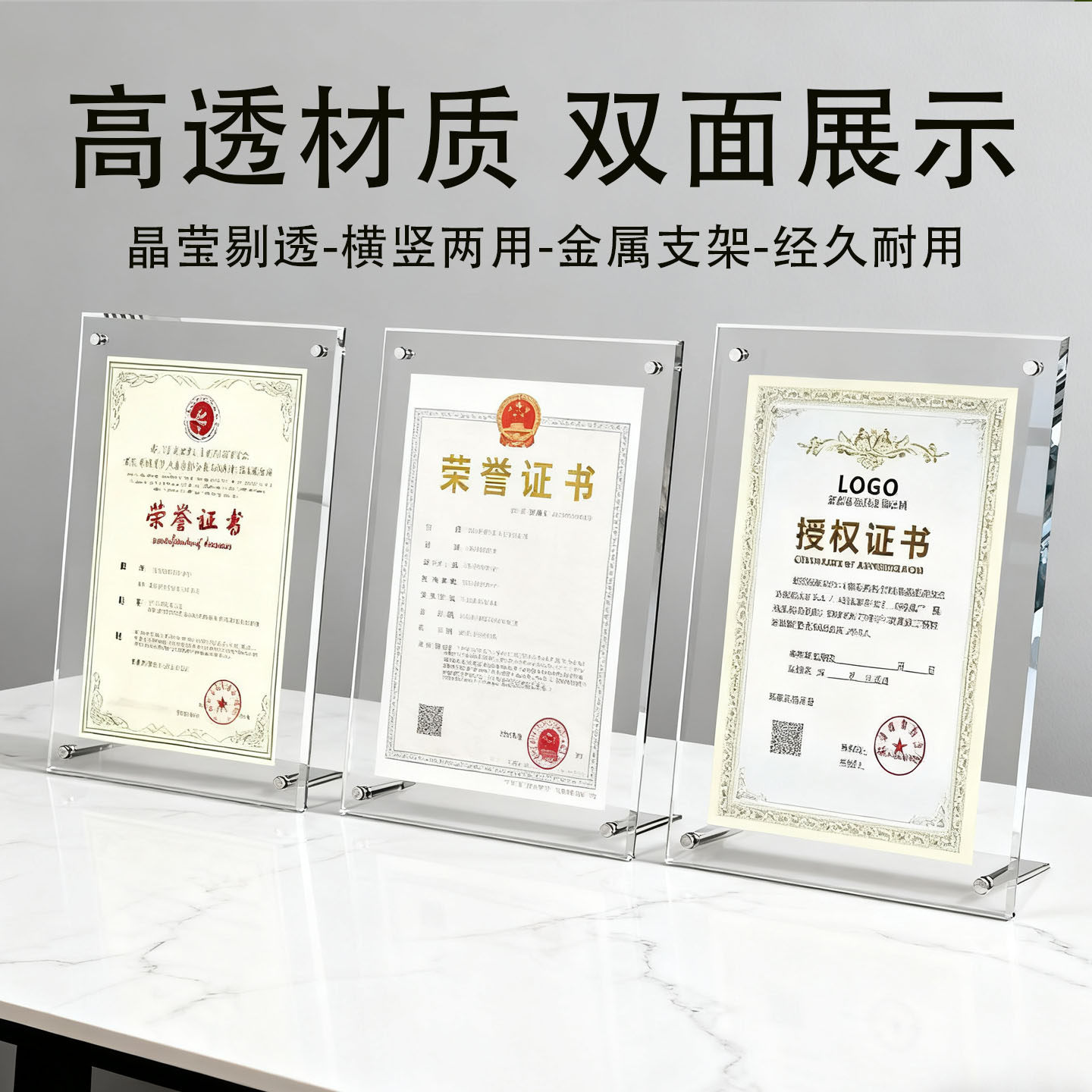 亚克力透明A4相框摆台专利荣誉证书框授权书营业执照A3挂墙奖状框