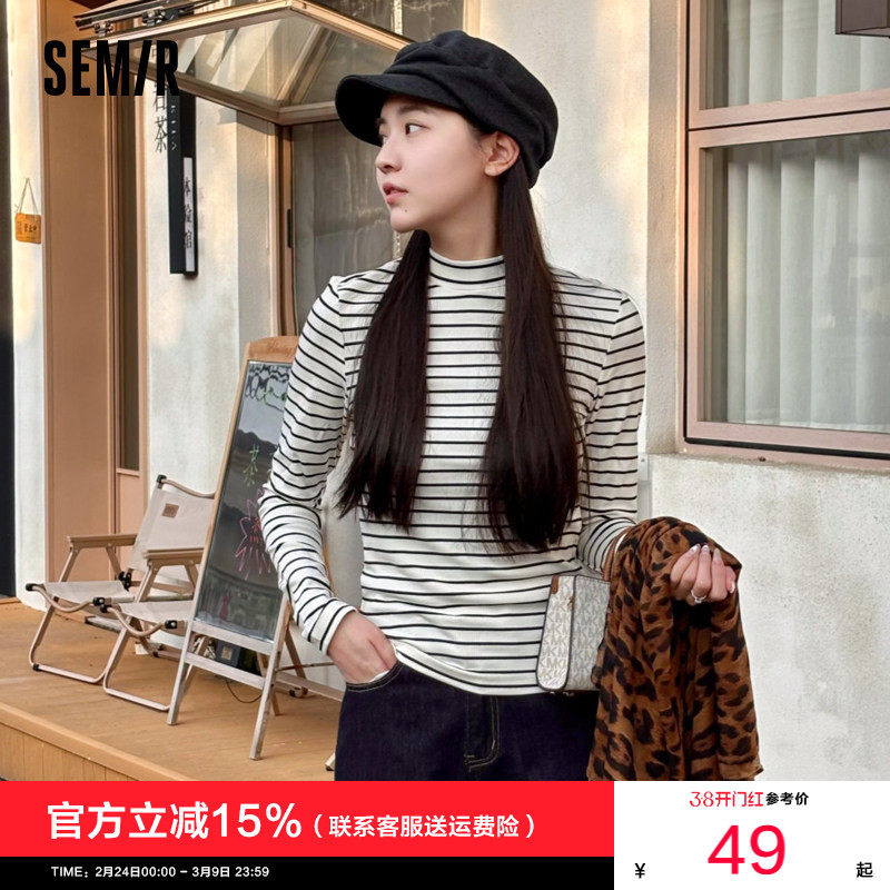 [商场同款]森马长袖T恤女紧身中领叠穿黑白条纹冬磨毛打底衫百搭