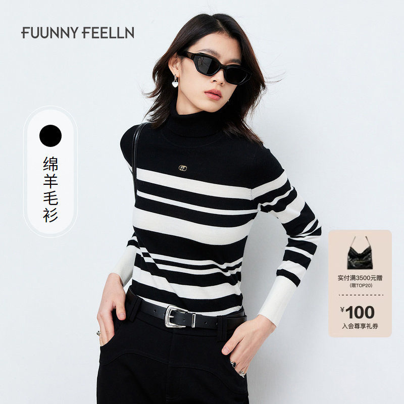 2025新款纯羊毛经典修身针织内搭高领堆堆领黑白条纹毛衣打底衫女