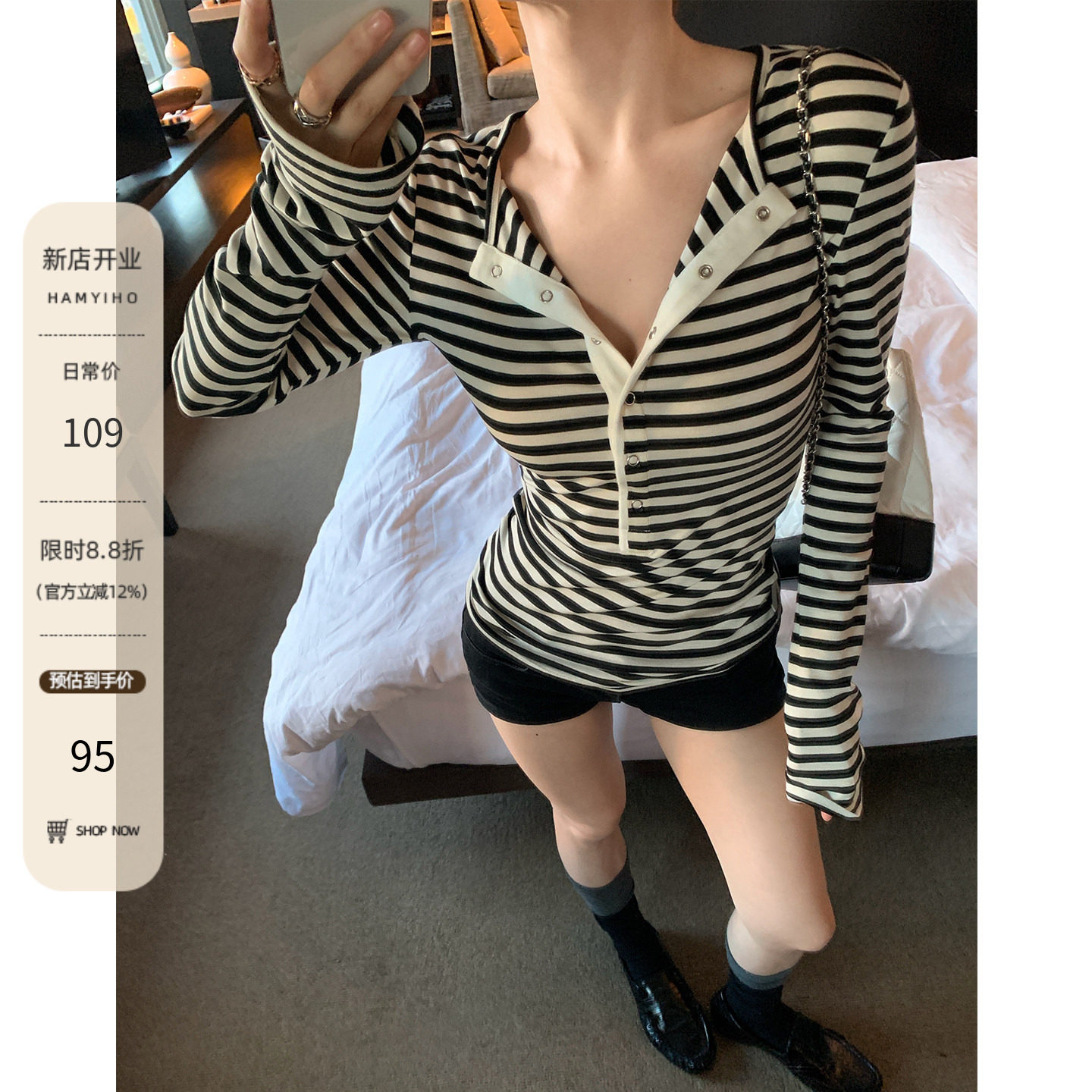 HAMYIHO天丝羊毛亨利领黑白条纹撞色打底衫女半开领内搭春季上衣