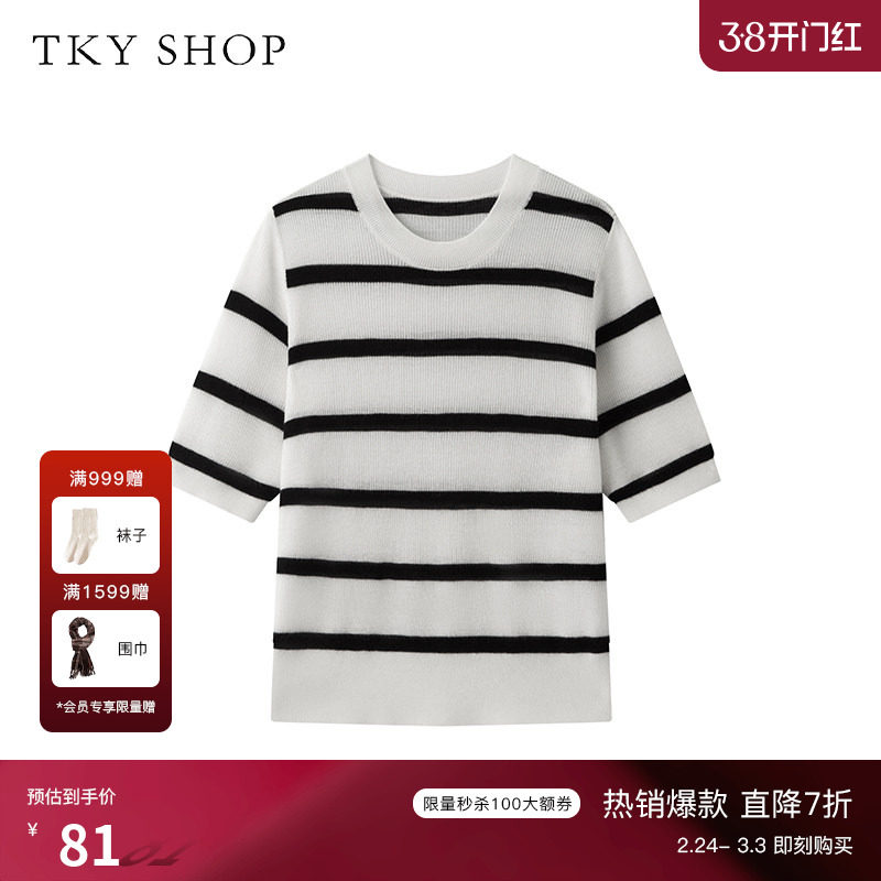 TKY SHOP圆领黑白条纹短袖针织衫女秋季宽松简约打底衫休闲薄上衣