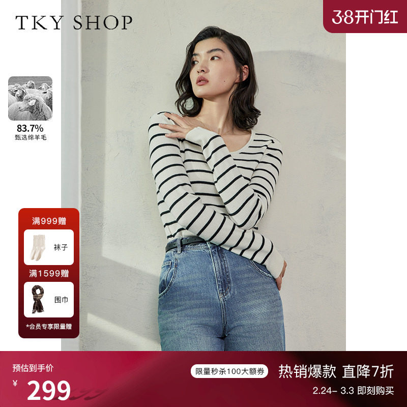 TKY SHOP复古黑白条纹撞色针织上衣女圆领套头羊毛衫修身打底衫