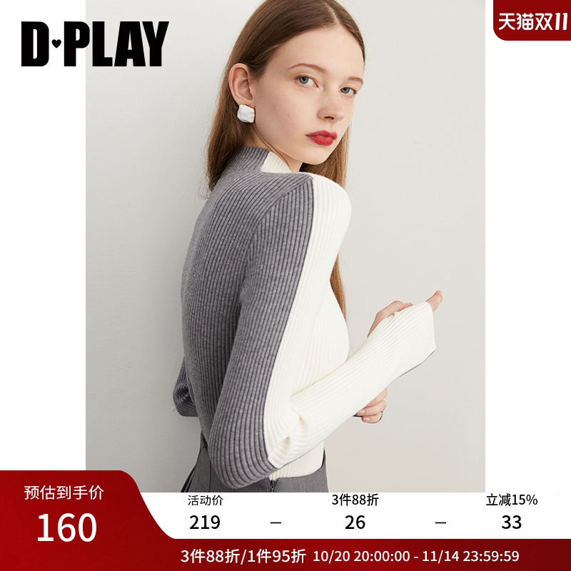 DPLAY2025年春季灰拼白色毛衣女长袖半高领加厚针织打底衫上衣