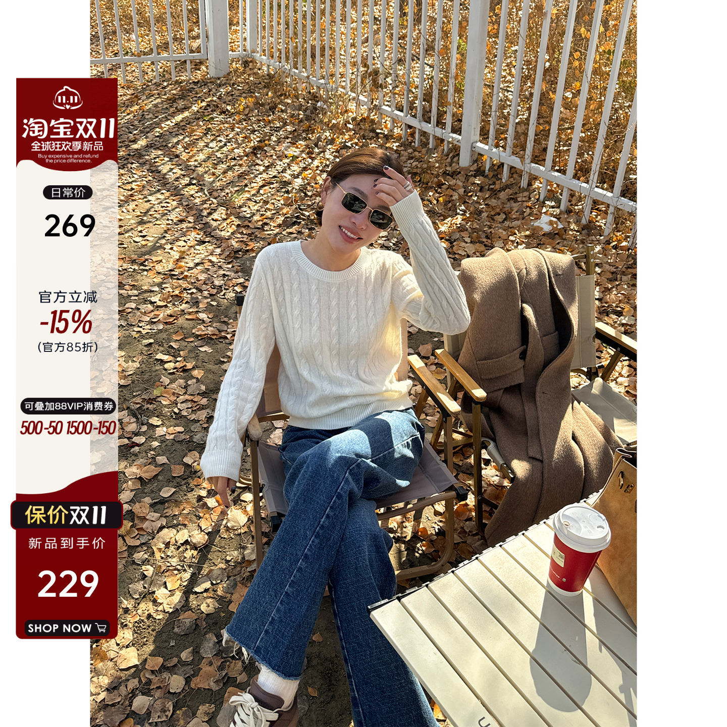 YANGLE_白色毛衣女2025年秋冬新款韩系慵懒风复古绞花绵羊毛上衣