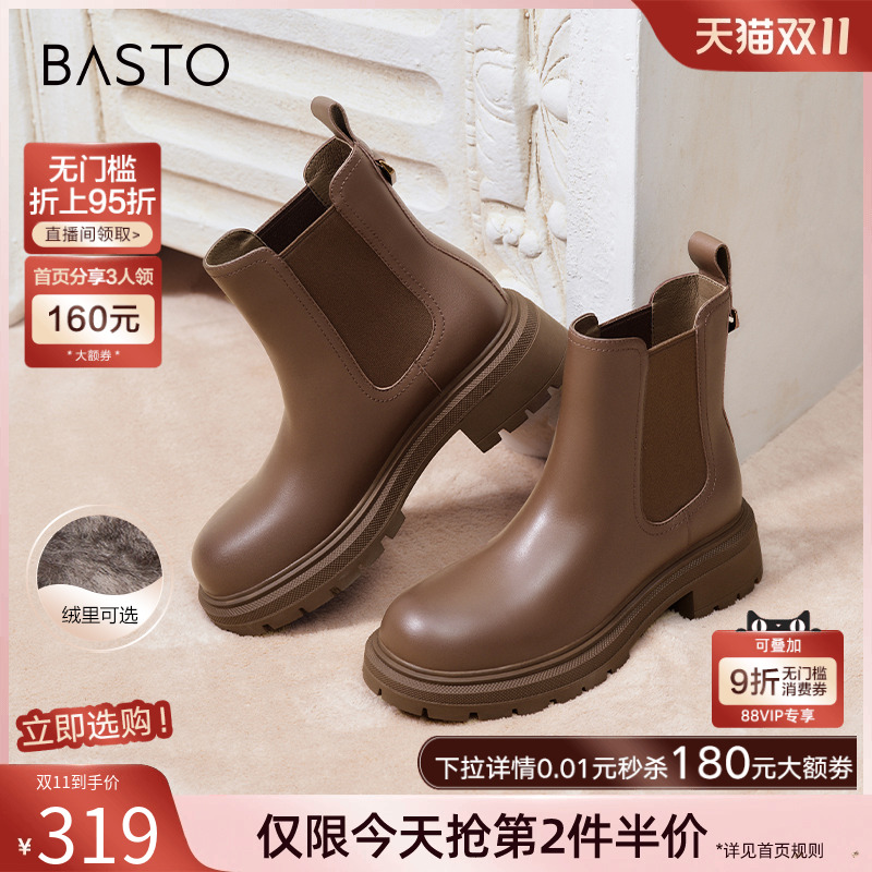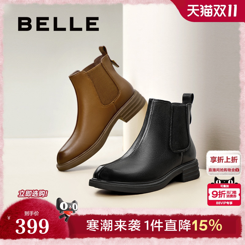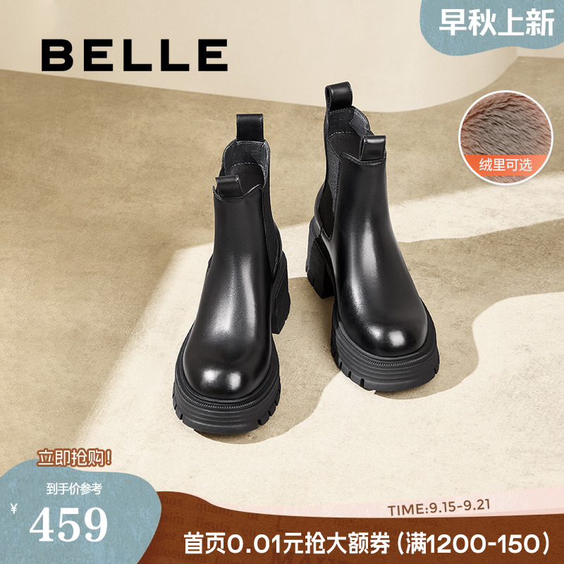百丽女靴子新款时装靴厚底羊皮切尔西靴冬季加绒保暖短靴B7D1DD预