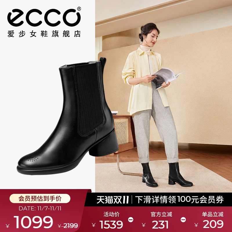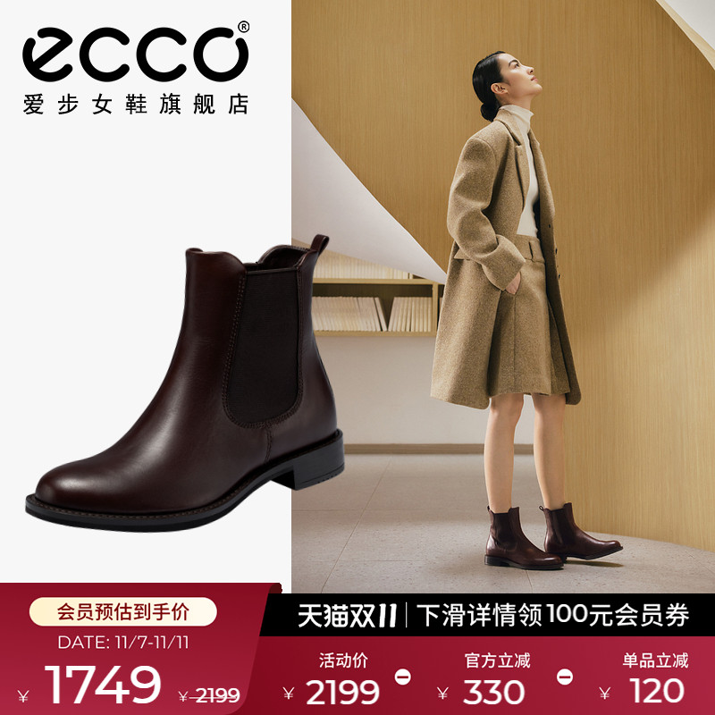 ECCO爱步靴子女 英伦风短靴切尔西靴真皮烟筒靴 雕塑奢华222433