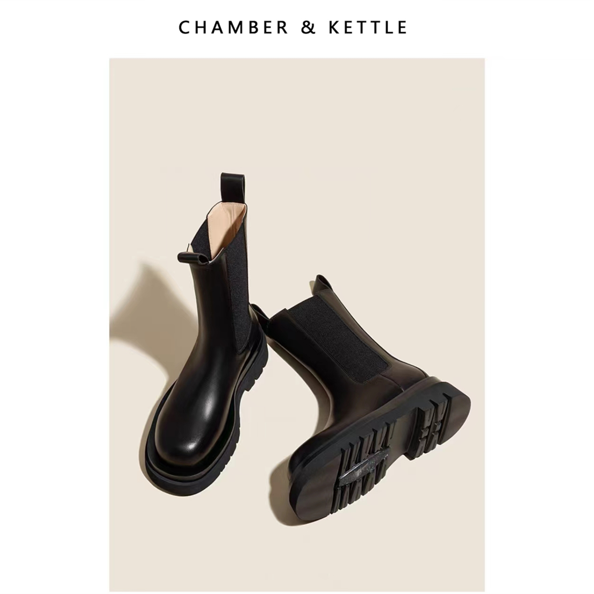 CHAMBER&KETTLE真皮马丁靴女英伦风瘦瘦中筒烟筒靴厚底切尔西短靴